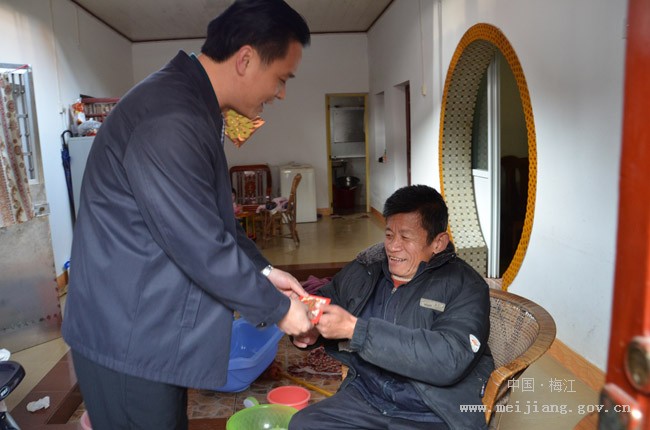 张书记一行首先来到福长村村委会与村干部进行座谈,详细了解该村集体收入、党支部组织生活、贫困户帮扶等情况,为他们送上春节慰问金。随后,张书记一行到该村贫困户曾宪秋和曾庆泗家中进行慰问,亲切询问他们的身体和生产、生活等情况,鼓励他们树立信心,克服困难,努力改善生活,并为他们送去了慰问金、大米和食用油。